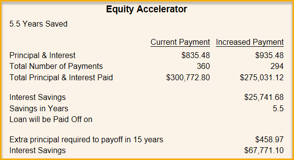 If a person were to make an additional $100 payment each month applied to principal on a $175,000 mortgage, it would shorten the loan by five years six months. If the person were to make $200 a month additional payments, it would shorten the loan by 9 years. $459 additional payment would shorten it to 15 years.